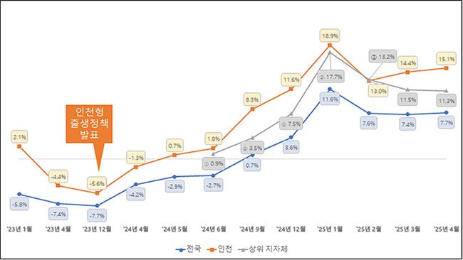 인천시는 지난해 6월 이후 출생아 수 증가율 전국 1위를 꾸준히 유지하고 있으며, 특히 2024년 10월부터 2025년 4월까지는 매달 두 자릿수 증가율을 기록했다.