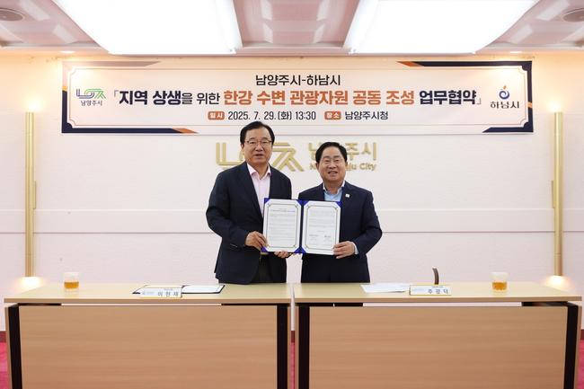 남양주시(시장 주광덕)는 29일 남양주시청에서 하남시(시장 이현재)와 `지역 상생을 위한 한강 수변 관광 자원 공동 조성 업무협약`을 체결했다고 밝혔다.