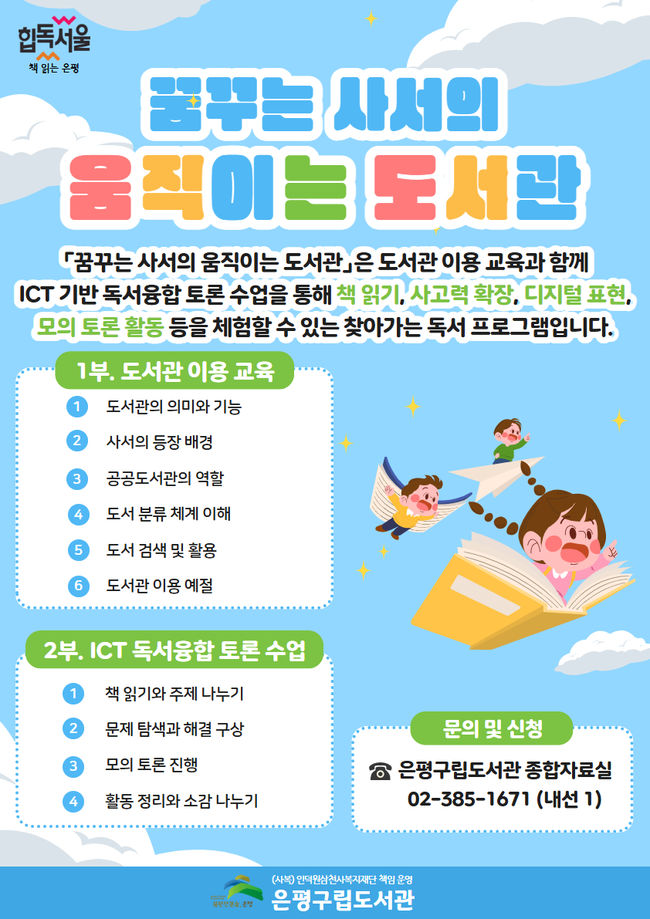 서울 은평구립도서관이 9월부터 11월까지 초등학교와 아동기관을 직접 찾아가 독서와 디지털 활용을 결합한 ‘꿈꾸는 사서의 움직이는 도서관’ 프로그램을 운영한다.