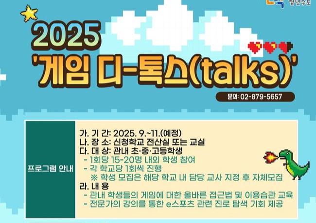관악구(구청장 박준희)는 청소년들이 게임을 건강하게 활용할 수 있도록 돕기 위해 오는 9월부터 `2025 `게임 디-톡스(Talks)`` 프로그램을 운영한다.