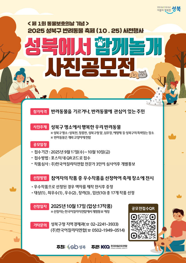 공모전 응모는 사진공모전 포스터에 안내된 QR코드를 통해 가능하다. 심사를 거쳐 총 17점을 선정해 10월 25일 열리는 성북구 반려동물 축제 현장에서 전시할 예정이다.