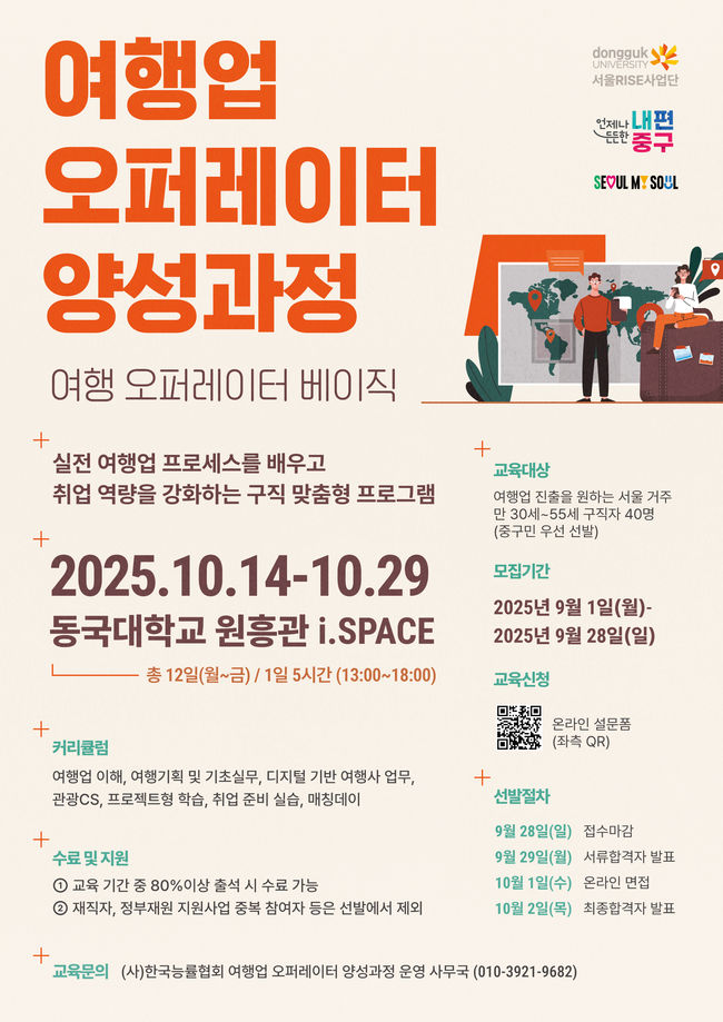 서울 중구가 관광산업 전문 인재를 양성하고 지역 관광업계의 인력난을 해소하기 위해 동국대 서울RISE사업단과 함께 ‘여행업 오퍼레이터 양성과정’을 운영한다.