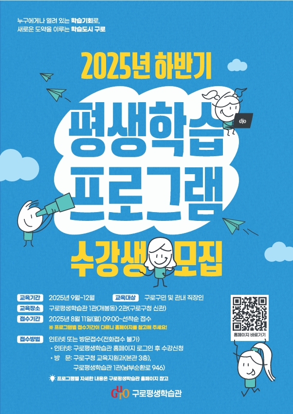 구로구(구청장 장인홍)는 오는 11일부터 ‘2025년 하반기 구로평생학습관’ 수강생 모집을 시작한다고 밝혔다. 이번 강좌는 구민의 자기계발과 삶의 질 향상을 위한 교육 기회를 제공하고자 마련됐으며, 9월부터 12월까지 약 4개월간 운영된다.