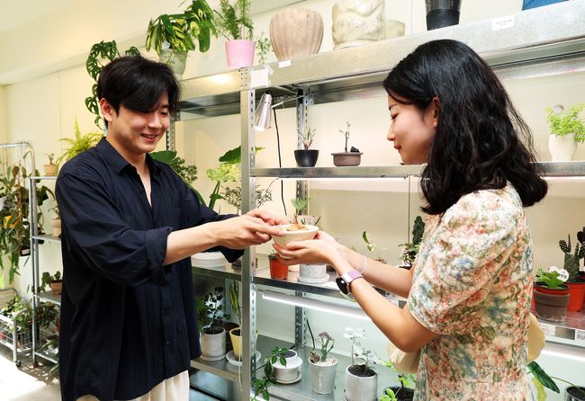 청년가게 15호점 `식물가게`에서 손님에게 설명하는 모습.