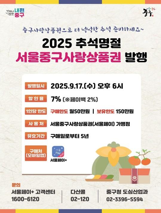 2025 추석명절 서울중구사랑상품권 발행 홍보 포스터.중구는 17일 오후 6시부터 ‘서울중구사랑상품권’을 서울페이플러스 앱에서 발행한다고 밝혔다.