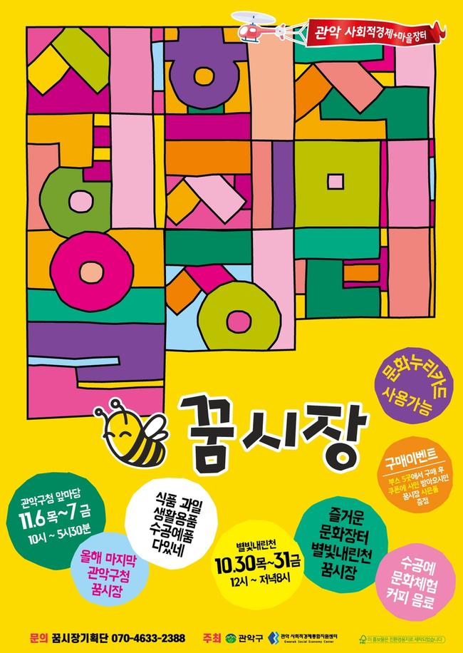 이어지는 11월 6일(수)과 7일(목)에는 10시부터 17시 30분까지 관악구청 앞마당에서 올해의 마지막 `꿈시장`이 운영된다.