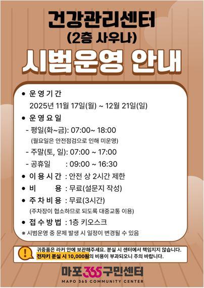 마포구(구청장 박강수)는 마포365구민센터 내 `건강관리센터(남·녀 사우나)` 정식 개관에 앞서 운영 안정성을 확보하고, 이용객 의견을 수렴하기 위해 2025년 12월 21일까지 시범운영을 시작한다.