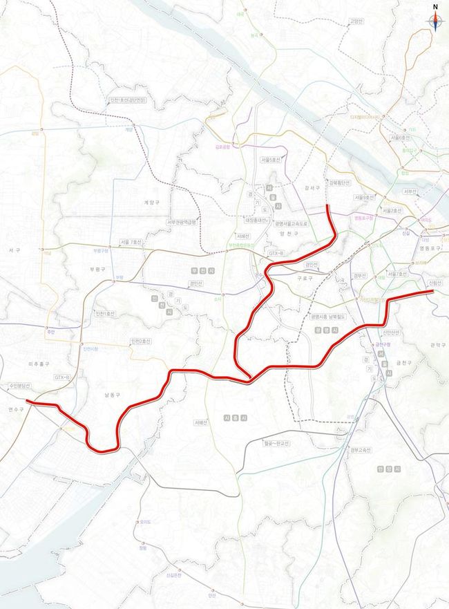 수도권 서남부 광역철도 민자 제안 노선(안).26일 구로구는 국토교통부가 최근 수도권 서남부 광역철도 민간투자사업과 관련해 관계 지방자치단체를 대상으로 보완 제안서에 대한 의견 조회를 진행하고 있다고 밝혔다.
